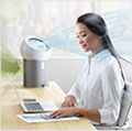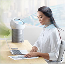 An office worker using a Dyson Pure Cool Me personal purifier fan
